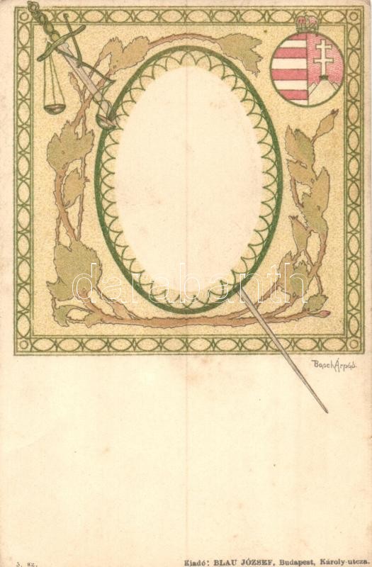 Leírás: Magyar címeres szecessziós művészlap. Blau József 3. sz. / Hungarian coat of arms. Art Nouveau litho s: Basch Árpád (fl)