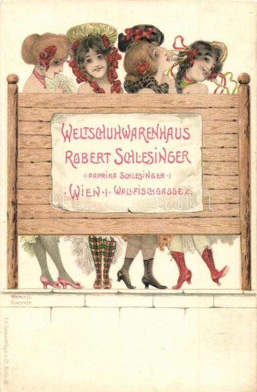 Leírás: Weltschuhwarenhaus Robert Schlesinger (Paprika Schlesinger). Wien I. Wallfischgasse 2. / Austrian (Viennese) footwear emporium's advertisement. Art Nouveau ladies. E.A. Schwerdtfeger & Co. litho s: Raphael Kirchner (Extremely rare!!!)