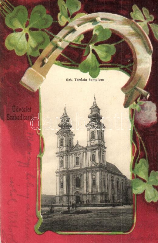 1901 Szabadka, Subotica; Szent Terézia templom. Szecessziós litho keret lóherével és patkóval / church. Art Nouveau litho frame with horse shoe and clovers