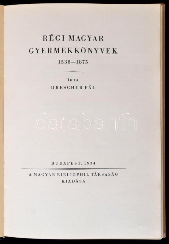 Drescher Pál: Régi magyar gyermekkönyvek. 1538-1875. Bp.,1934, Magyar ... https://www.darabanth.com/hu/30-Nagyaukcio/30.1/Konyvek/Konyvek-Egyeb-ritkasagok~12169/Drescher-Pal-Regi-magyar-gyermekkonyvek-1538-1875-Bp-1934-Magyar-Bibliophil-Tarsasag-Kiad~II1862775