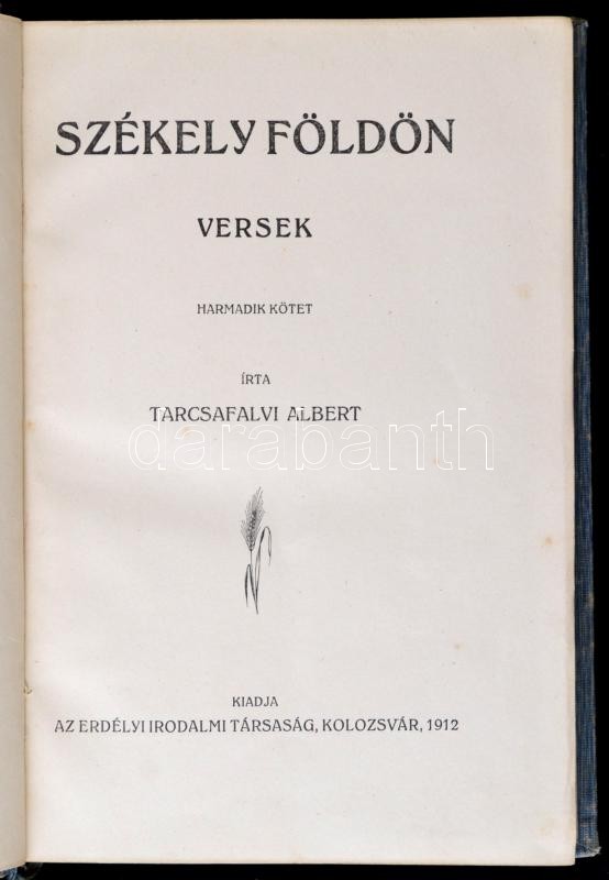 Tarcsafalvi Albert (1856-1926): Székelyföldön. Versek. Harmadik kötet. Kolozsvár, 1912, Erdélyi Irodalmi Társaság, (Kolozsvár, Stief Jenő és Társa Kőnyomdai Intézete), 8+180 p. Kiadói festett, aranyozott, illusztrált egészvászon-kötés, a borítón kopásnyomokkal.