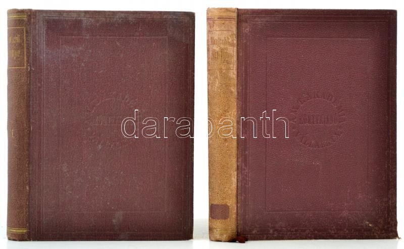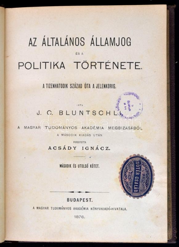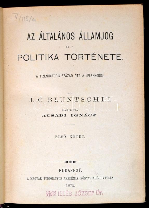 J(ohann) C(aspar) Bluntschli: Az általános államjog és a politika története a tizenhatodik század óta a jelenkorig. I-II. kötet. Fordította: Acsádi Ignác. Bp.,1875, MTA, 8+383+4+398 p. Kiadói aranyozott egészvászon-kötés, Hirháger-kötés, az egyik gerinc fakó, a borítók kissé kopottak, intézményi bélyegzővel, magánkönyvtári bélyeggel. Dr. viski Illés József (1871-1944) jogász, jogtörténész, politikus, MTA tag, a pozitivista jogtörténeti kutatások egyik utolsó nagy alakjának a névbélyegzőjével.