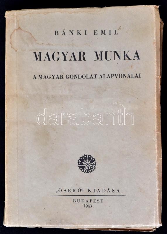 Bánki Emil: Magyar munka. A magyar gondolat alapvonalai. Bp., 1943, "Őserő". Kiadói papírkötés, foltos borítóval.