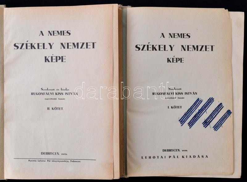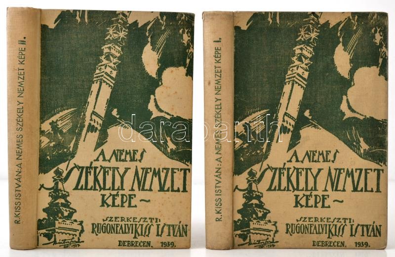 Rugonfalvi Kiss István: A nemes székely nemzet képe I-II. Debrecen, 1939-1940. Lehotai Pál kiadása. (3 köteteben teljes) 447 p. 2 sztl. lev. 1 színes t. + 1 kihajtható, nagyméretű térképlap., 496 p. 1 sztl. lev. (1 térképmellet hiány), Kiadói, festett egészvászon-kötésben, jó állapotban.