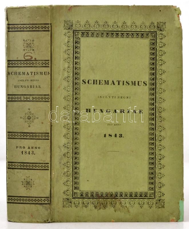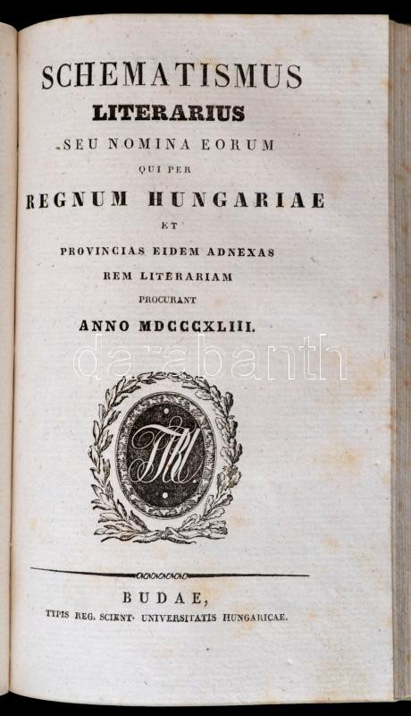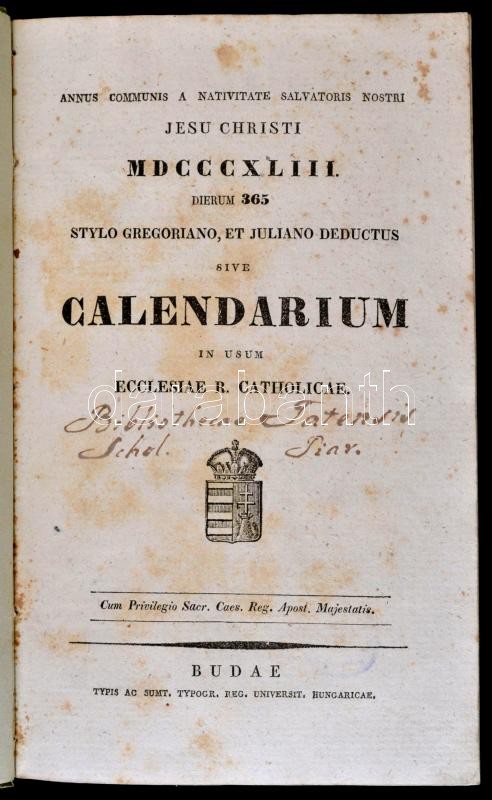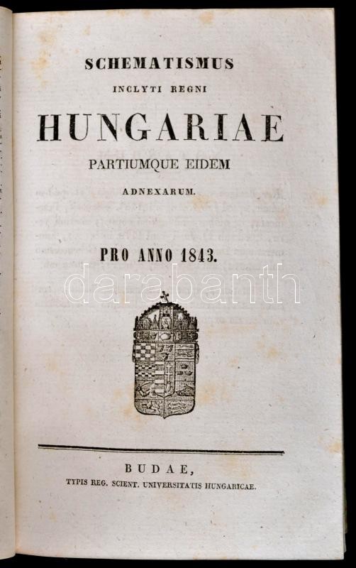[Schematismus 1843.]: Annus communis a nativitate Salvatoris nostri Jesu Christi MDCCCXLIII. Dierum 365. Sylo Gregoriano et Juliano deductus sive Calendarium in usum ecclesiae r. catholicae. Budae,1843,Reg. Univerist. Hungariae, XIII p.+ 16 sztl. lev. Schematismus inclyti regni hungariae partiumque eidem adnexarum. Pro anno 1843. Budae,1843, Reg. Scient. Universitatis Hungariae, 433 p. Schematismus Literarius seu nomina eorum, qui per Regnum Hungariae et provincias eidem adnexas rem litterariam procurant. Anno MDCCCXLIII. Budae,1843, Reg. Scient. Universitatis Hungariae, 101 p. Latin nyelven. Kiadói kartonált papírkötés, a hátsó borítón koronás címer ábrázolással, kissé kopottas borítóval, egy sarkán javításnyomokkal, egy sarka kissé sérült, de belül jó állapotban.