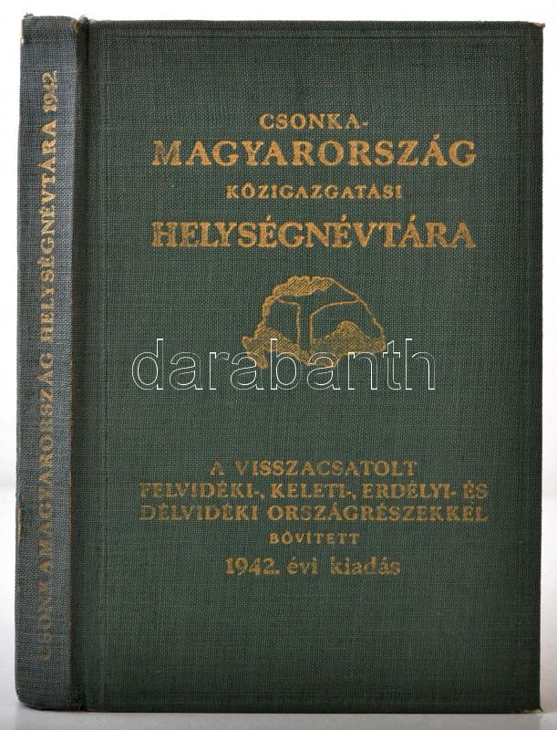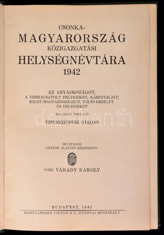 Leírás: Csonka-Magyarország közigazgatási helységnévtára a visszacsatolt felvidéski-, keleti-, erdélyi-, és délvidéki országrészekkel bővített 1942 évi kiadás. . Szerk.: Várady Károly. Bp., 1942, Hornyánszky Viktor. Kiadói vászonkötésben