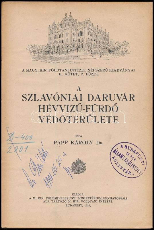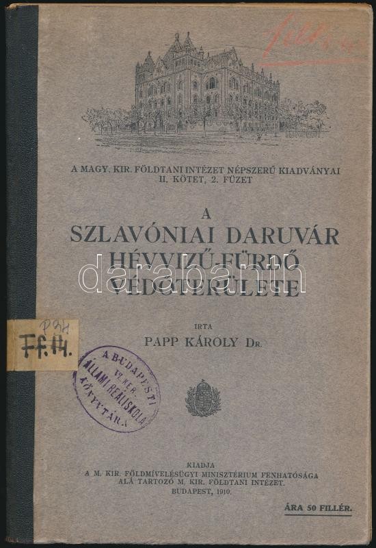 Dr. Papp Károly: A szlavóniai Daruvár hévvizű-fürdő védőterülete. M. Kir. Földtani Intézet népszerű kiadványai II. kötet, 2. füzet. Bp.,1910, M. Kir. Földtani Intézet, 4+17-47 p.+ 1 kihajtható térkép. Korabeli átkötött félvászon-kötés, intézményi bélyegzővel.