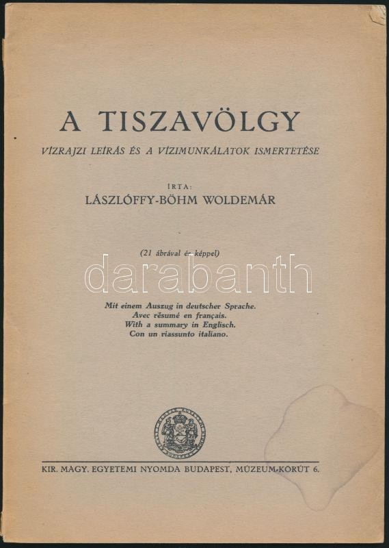 Lászlóffy-Böhm Woldemár: A Tiszavölgy: vízrajzi leírás és a vízimunkálatok ismertetése. Bp., , Kir. M. Egyetemi Nyomda, 39 p. Kiadói papírkötés, a gerincen szakadással, a borítón és a címlapon folttal.
