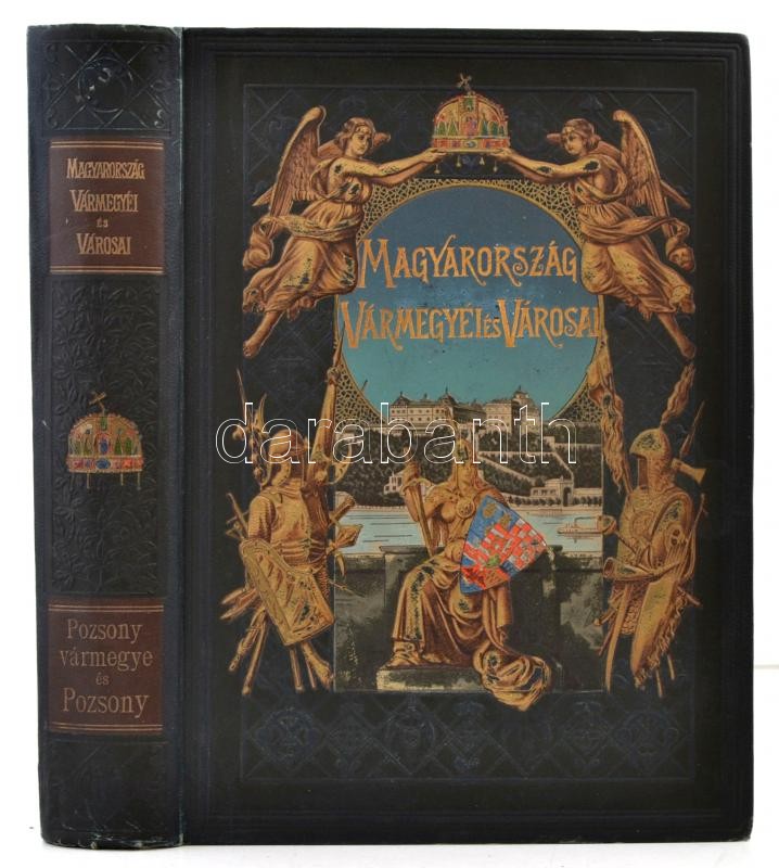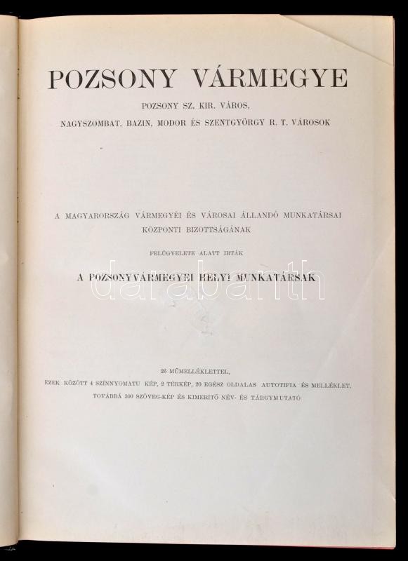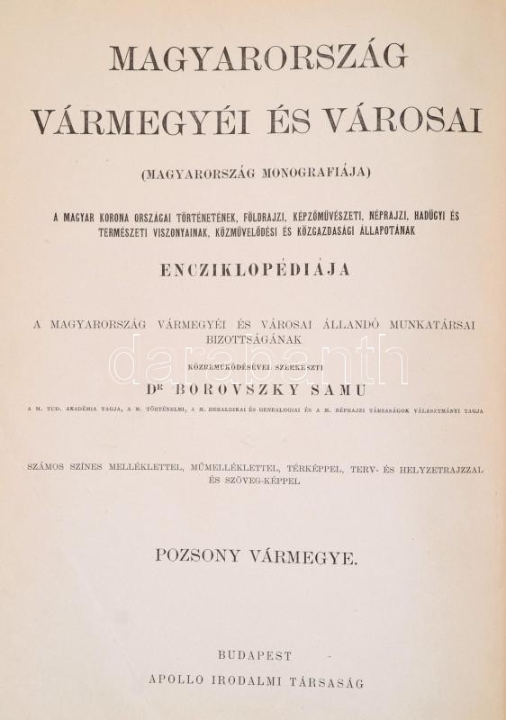 Pozsony vármegye, Pozsony sz. kir. város, Nagyszombat, Bazin, Modor és Szentgyörgy r. t. városok. Szerk.: Dr. Borovszky Samu. Magyarország vármegyéi és városai. Magyarország monográfiája. Bp.,é.n., Apollo Irodalmi Társaság, (Légrády-ny.), 2+X+754 p.+12 t.(ebből 4 színes)+ 2 kihajtható térkép. Kiadói aranyozott, festett, dombornyomásos egészvászon sorozatkötésben, Leszik-kötés, festett lapszélekkel, a gerincen, borítón kis kopásnyomokkal, a címlapon javítással, kis hiánnyal.