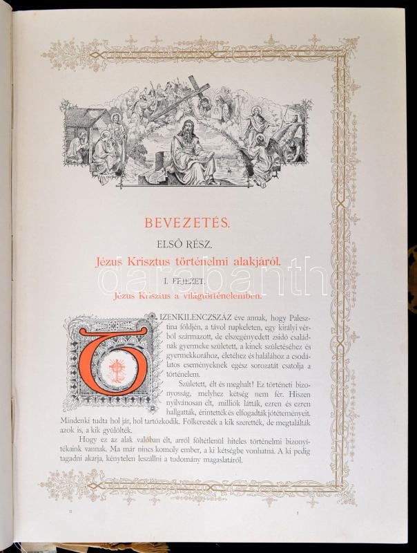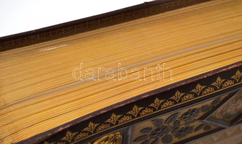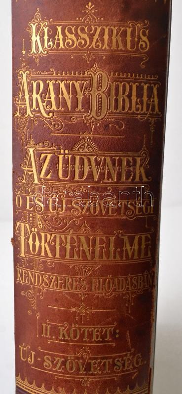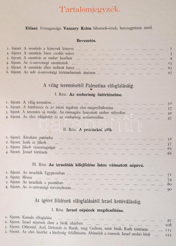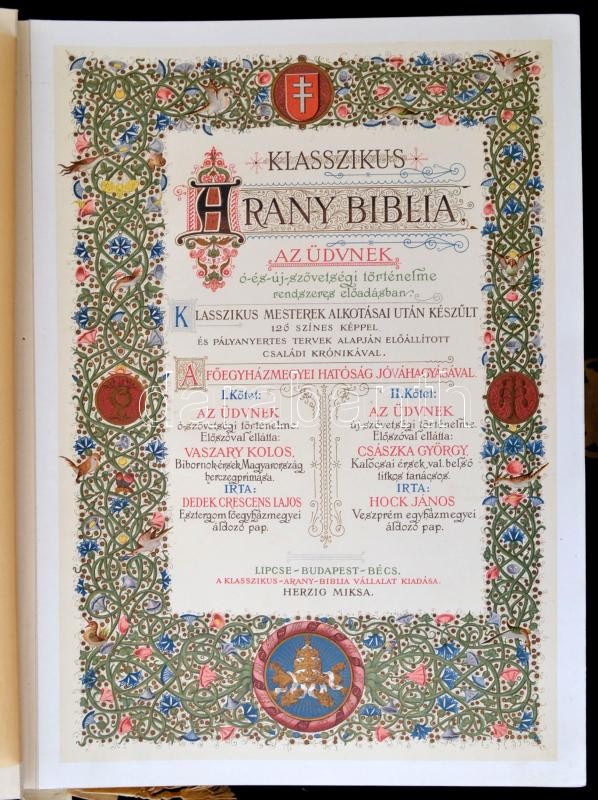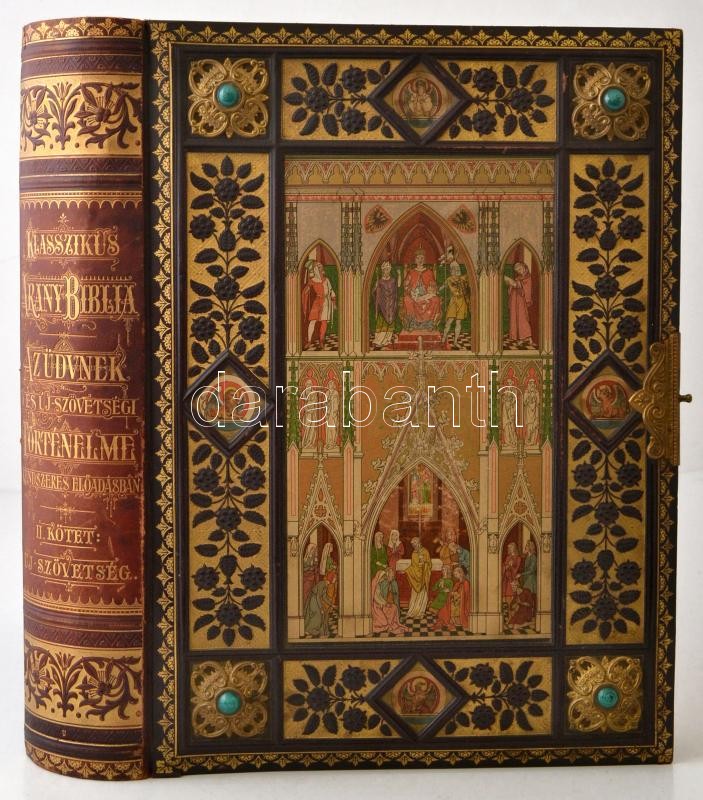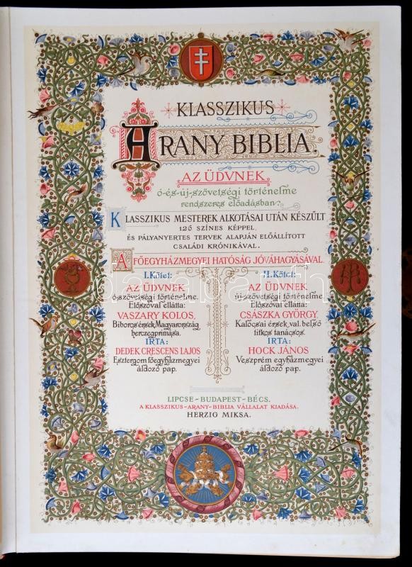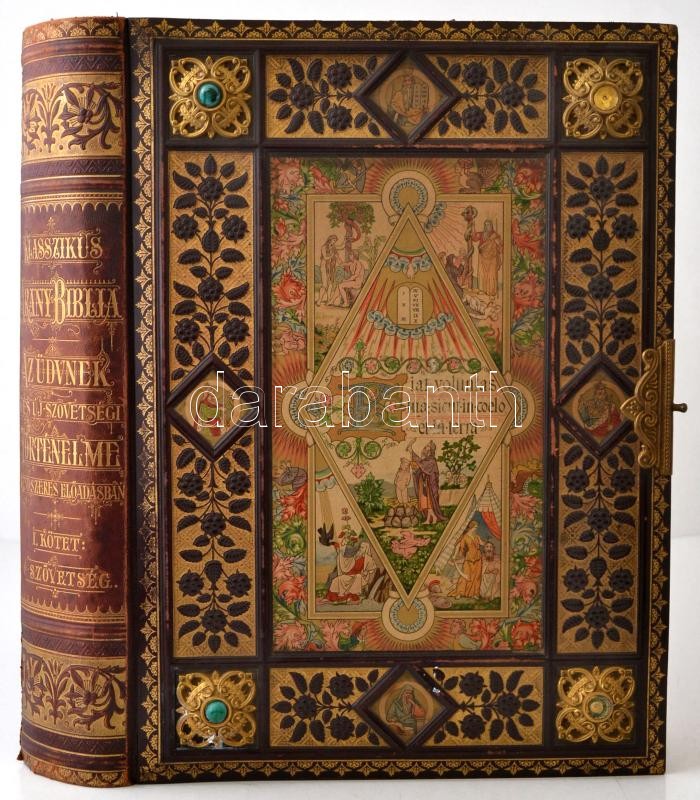 Biblia. Az üdvnek ó- és új-szövetségi történelme rendszeres előadásban. I-II. kötet. Klasszikus mesterek alkotásai után készült 126 színes képpel, és pályanyertes tervek alapján előállított családi krónikával. I. kötet: Az üdvnek Ó-szövetségi történelme. Előszóval ellátta: Vaszary Kolos. Írta Dedek Crescens Lajos. II. kötet: Az üdvnek új-szövetségi történelme. Előszóval ellátta: Császka György. Írta: Hock János. Lipcse, Budapest, Bécs, 1897, Herzig Miksa. Gazdagon díszített, aranyozott , dombornyomott, féldrágakövekkel kirakott, fémcsatos egészbőr kötésben. Az I. kötetről két féldrágakö hiányzik, egyébként, nagyon szép, tiszta állapotban.