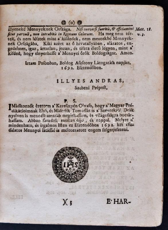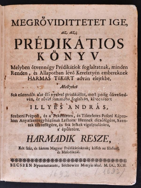 Illyés András: Megrövidittetet Ige az az; Predikátios Könyv. III. rész: Megrövidittetet Ige az az; Predikátios Könyv, Melyben ötvennégy Prédikátiok foglaltatnak, minden Rendben, és Állapotban lévő Keresztyén embereknek Hármas Tükört adván elejekbe. Mellyeket sok esztendök alatt élö nyelvel prédikállott, most pedig rendesen öszveszedvén, rövid sommában foglalván, kibocsátott. Illyés András, Szebeni Prépost, és a` Tekéntetes, és Tiszteletes Posoni Káptolom Anyaszentegyházának Lectora: Istennek nagyobb dicsösségére, Szenteknek tisztességére, és sok lelkeknek épületére, és épületére. Bécs, 1692, Sischowitz Mátyás-ny., 8+359+1 p. Átkötött modern műbőrkötés, az utolsó lap egy részét pótolták, restaurálták, egy-két lapon aláhúzással, kisebb foltokkal.