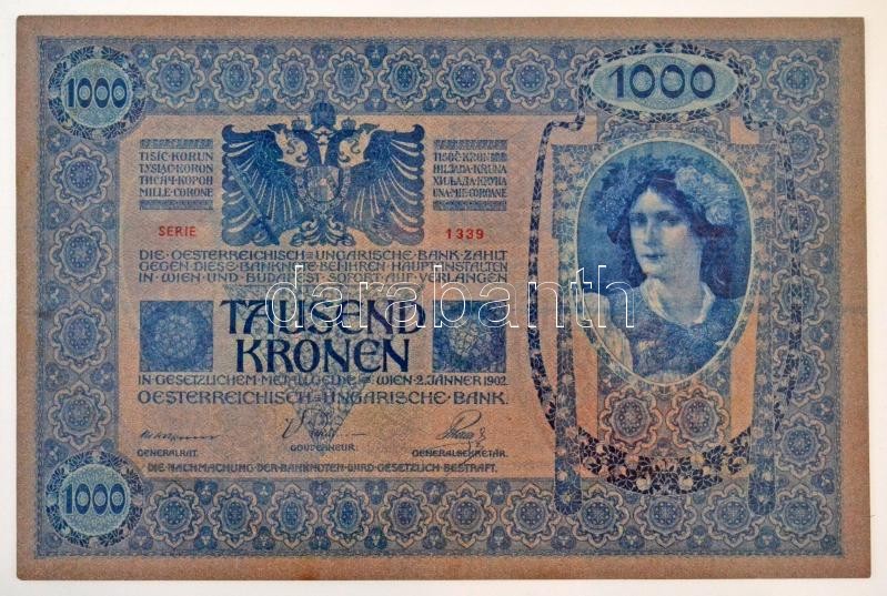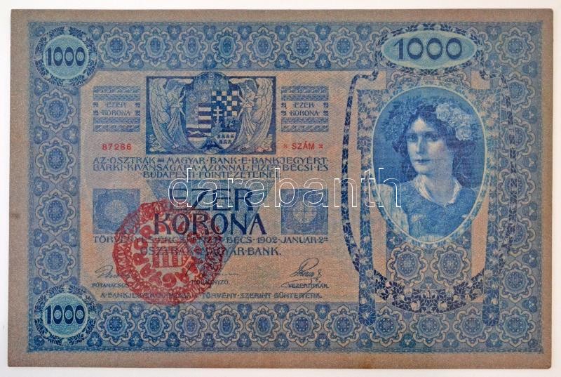 1902. 1000K piros, "MAGYARORSZÁG" körbélyegzővel T:I / Hunga... https://www.darabanth.com/hu/30-Nagyaukcio/30.1/Numizmatika/Magyar-es-kulfoldi-bankjegyek~12141/1902-1000K-piros-MAGYARORSZAG-korbelyegzovel-TI-Hungary-1902-1000-Korona-with-red-MAGYA~II1846173