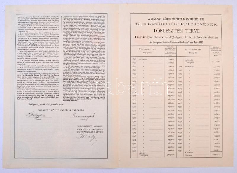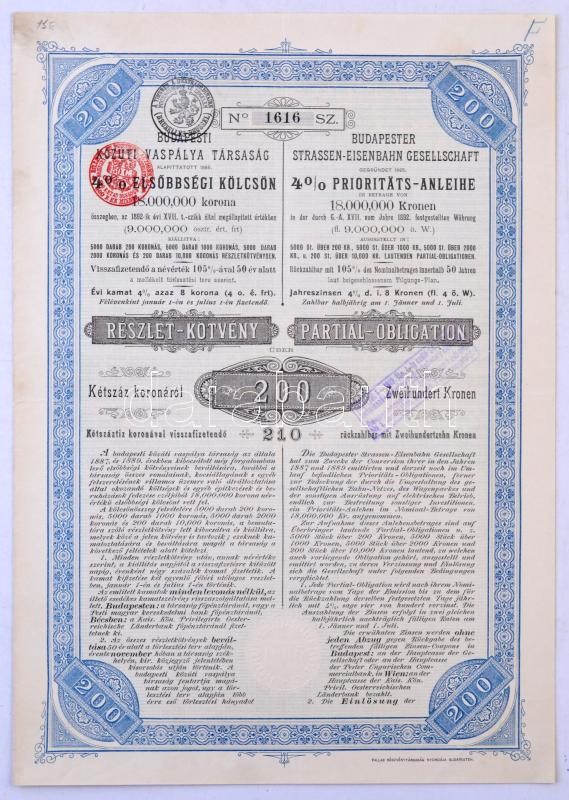 Budapest 1895. "Budapesti Közúti Vaspálya Társaság - 4% elsőbbségi kölcsön" kötvénye 200K-ról, bélyegzésekkel, két nyelven T:III szép papír / Hungary / Budapest 1895. "Budapesti Közúti Vaspálya Társaság - 4% elsőbbségi kölcsön" about 200 Korona, with cancellations, bilingual C:F fine paper