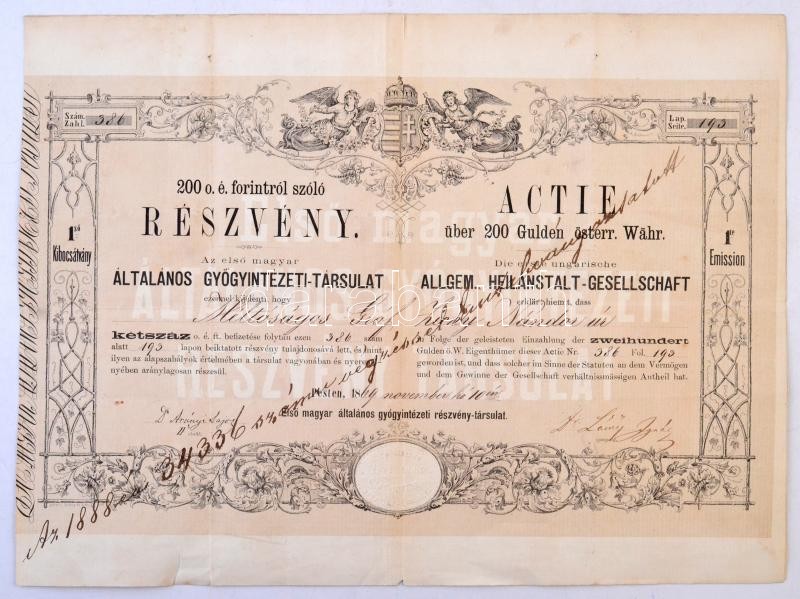 Pest 1869."Az első magyar általános gyógyintézeti-társulat" részvénye 200Ft-ról, gróf Zichy Nándor részére, szelvényekkel és szárazpecséttel, lyukasztással érvénytelenítve T:III széleken szakadások /