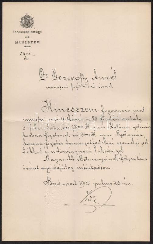 Leírás: 1905 Előléptetési okmány Dezsöffy Aurél részére Vörös László kereskedelemügyi miniszter saját kezű aláírásával