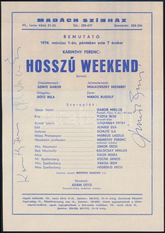 Leírás: 1974 Karinthy Ferenc (1921-1992), Almási Éva (1942-), Simor Erzsi (1913-1977) aláírásai a Madách színház Hosszú Weekend c. előadásának szórólapján.
