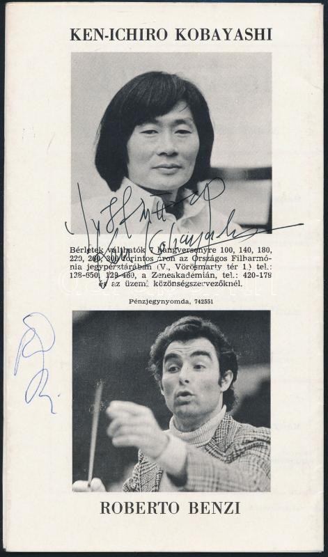 1975 Ken-ichiro Kobayashi (1940-), Roberto Benzi (1937-) karmesterek, ... https://www.darabanth.com/hu/300-Gyorsarveres/300.0/Festmeny-mutargy-papirregiseg-egyeb/Alairas~18/1975-Ken-ichiro-Kobayashi-1940--Roberto-Benzi-1937-karmesterek-es-Gidon-Kremer-1947-heged~II1606584