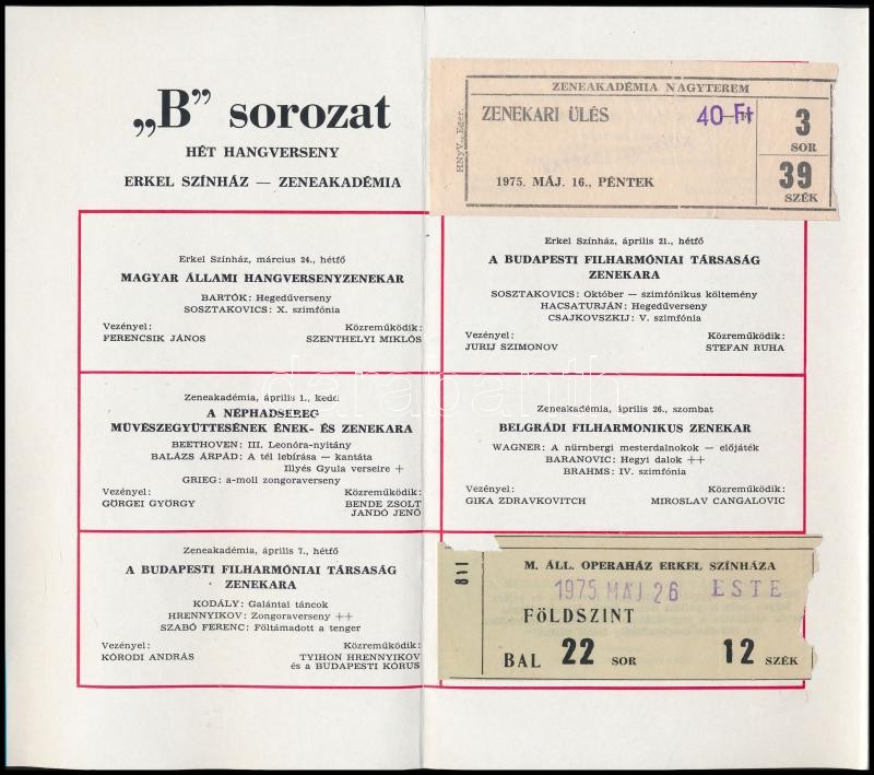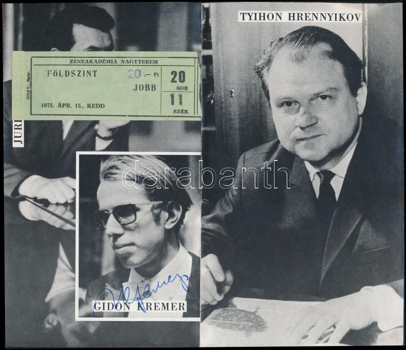 Leírás: 1975 Ken-ichiro Kobayashi (1940-), Roberto Benzi (1937-) karmesterek, és Gidon Kremer (1947-) hegedűművész aláírásai a Zeneakadémia 1975-ös Tavaszi Bérletén, beragszotott jegyekkel./
