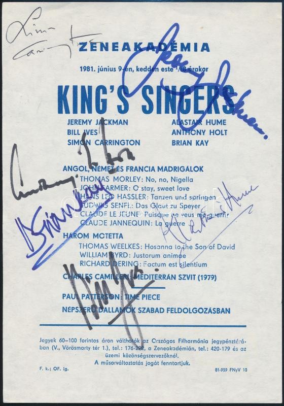 1981 King's Singers tagjainak (Jeremy Jackman, Bill Ives, Simon Carrington, Alastair Hume, Anthony Holt, Brian Kay.) aláírásai 1981-es Zenekadémián tartott koncertjük szórólapján.