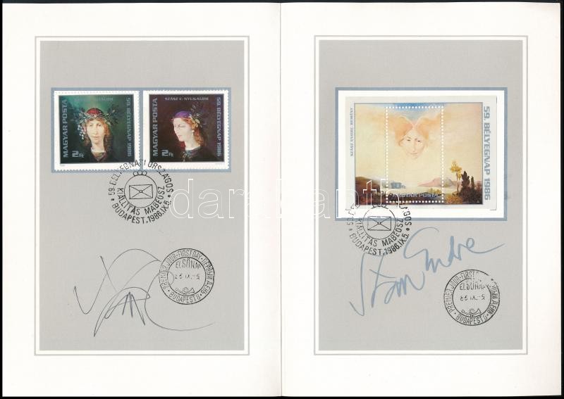 Leírás: 1986 Szász Endre (1926-2003) grafikus által kétszer aláírt 59. bélyegnapi emléklapon, bélyegekkel