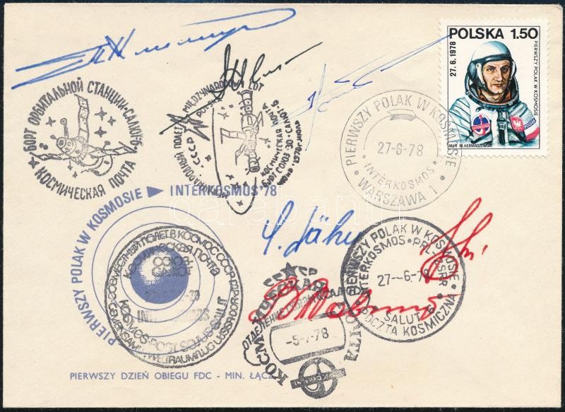Leírás: Valerij Bikovszkij (1934- ), Pjotr Iljics Klimuk (1942- ), Vlagyimir Kovaljonok (1942- ) szovjet, Sigmund Jähn (1937- ) német és Mirosław Hermaszewski (1941- ) lengyel űrhajósok aláírásai emlékborítékon /