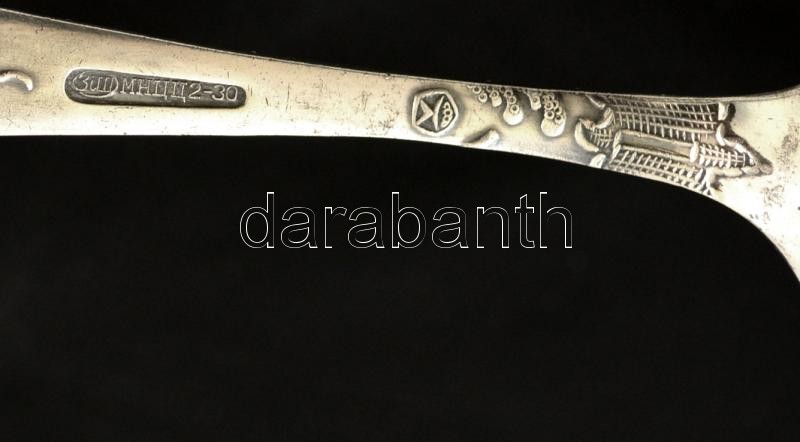 Leírás: Szovjet kanál készlet (12 db), díszdobozban, ezüstözött alpakka, h:18 cm