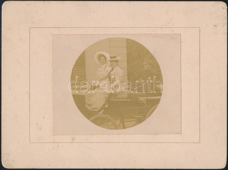 Leírás: 1898 Hölgyek a bakon, katonával, kartonra kasírozott fotó, 5,5x7 cm