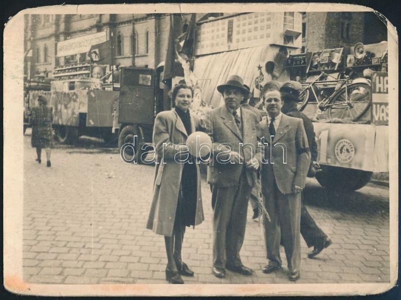 Leírás: 1947 Készülődés a május elsejei felvonulásra, háttérben a Hangya Szövetkezet kocsijával, apró sérülésekkel, 9x12 cm