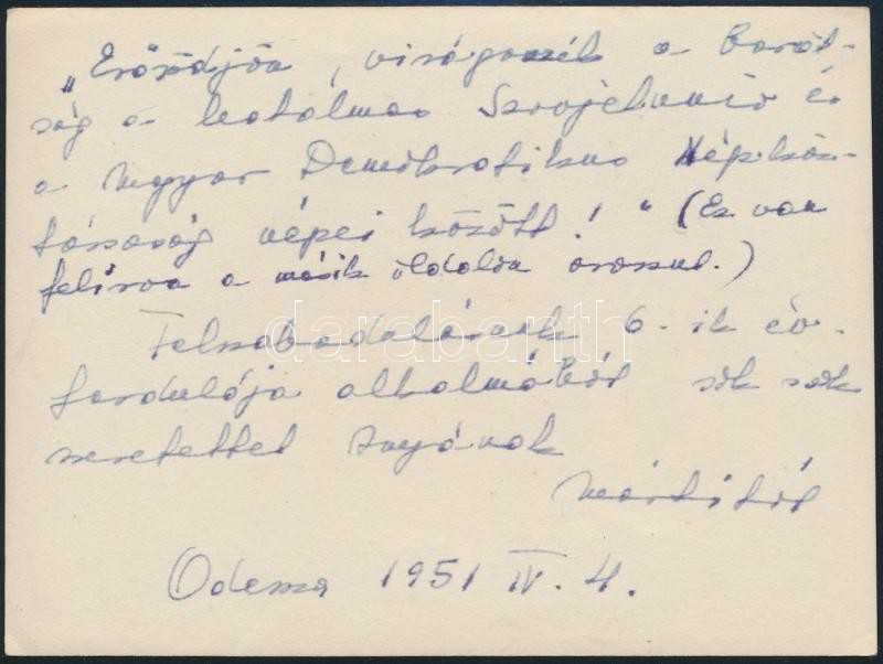 1951 Magyarország felszabadulásának hatodik évfordulója, fotó, hátuljá... https://www.darabanth.com/hu/300-Gyorsarveres/300.0/Festmeny-mutargy-papirregiseg-egyeb/Foto~19/1951-Magyarorszag-felszabadulasanak-hatodik-evforduloja-foto-hatuljan-feliratozva-OdesszC3~II1608124
