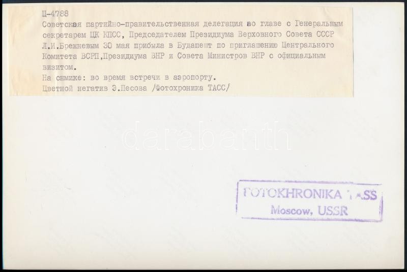 Leírás: 1979 Brezsnyev magyarországi látogatása, színes sajtófotó (Fotohronik Tass), hátulján feliratozva, pecséttel jelzett, 16×24 cm
