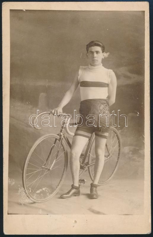 cca 1908 Kerékpáros versenyző, fotólap Hauser S. műterméből, hátulján ... https://www.darabanth.com/hu/300-Gyorsarveres/300.0/Festmeny-mutargy-papirregiseg-egyeb/Foto~19/cca-1908-Kerekparos-versenyzo-fotolap-Hauser-S-mutermebol-hatuljan-pecsettel-jelzett-1~II1609040