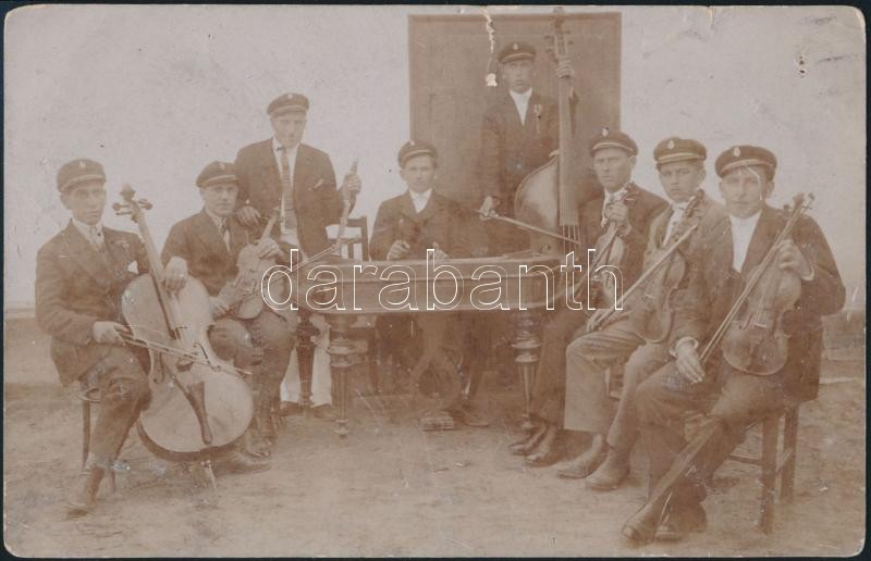 cca 1910 Nyolctagú zenekar egyensapkában, fotólap, szakadással, 9x14 c... https://www.darabanth.com/hu/300-Gyorsarveres/300.0/Festmeny-mutargy-papirregiseg-egyeb/Foto~19/cca-1910-Nyolctagu-zenekar-egyensapkaban-fotolap-szakadassal-9x14-cm~II1607733