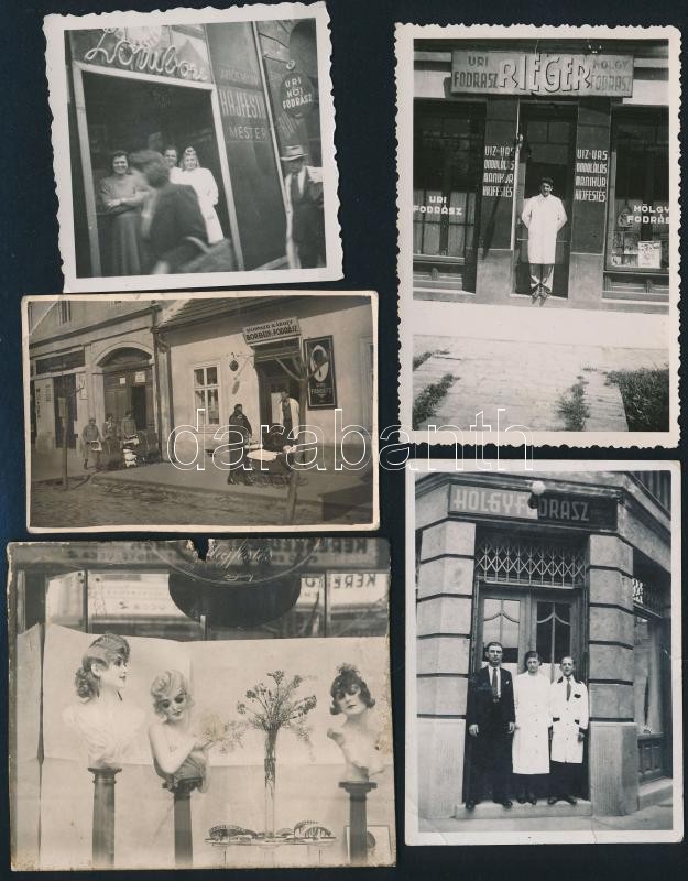 Leírás: cca 1920-1950 Fodrászüzletek és kirakatuk, 5 db fotó, 6x6 és 7x8,5 cm