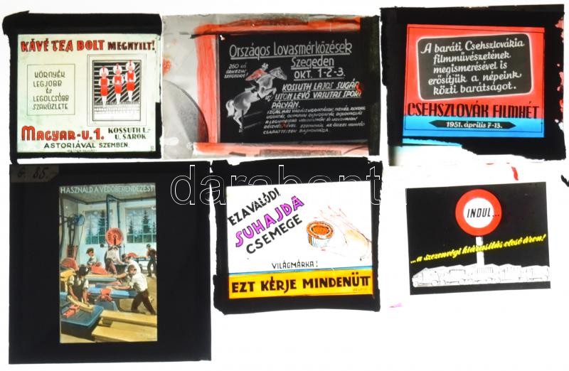 cca 1947 Fekete György (1904-1990) budapesti fényképész specialitása a mozikban nagyfilmek előtt vetített álló diapozitív reklámképek voltak, ez az összeállítás vegyesen tartalmaz reklámokat, tájékoztatókat, 13 db diapozitív kép üveglemezen, 8x8 cm és 6x7 cm között