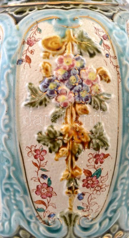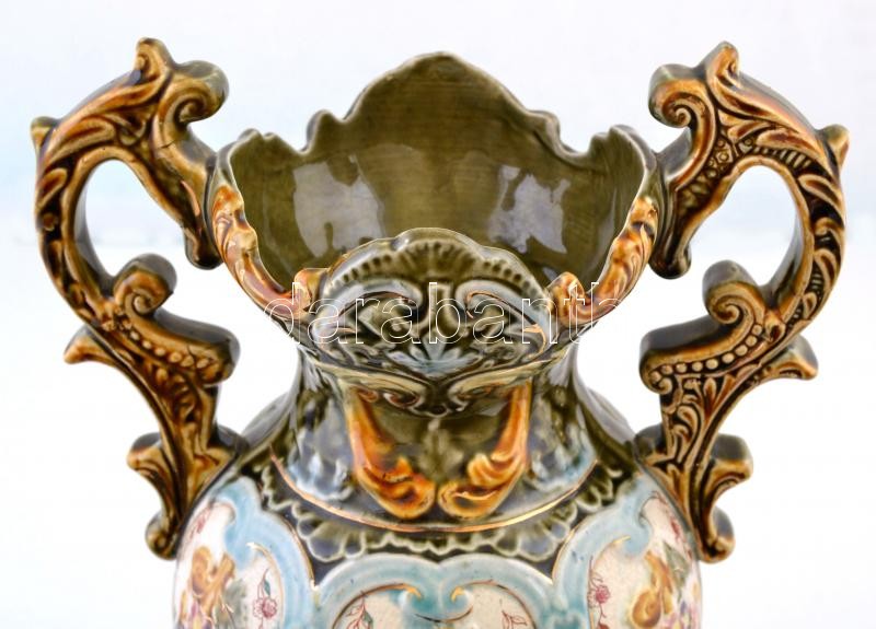 Leírás: Zsolnay jelzéssel: Amfora váza, mázas kerámia, részben kézzel festett, kopott, m:34 cm