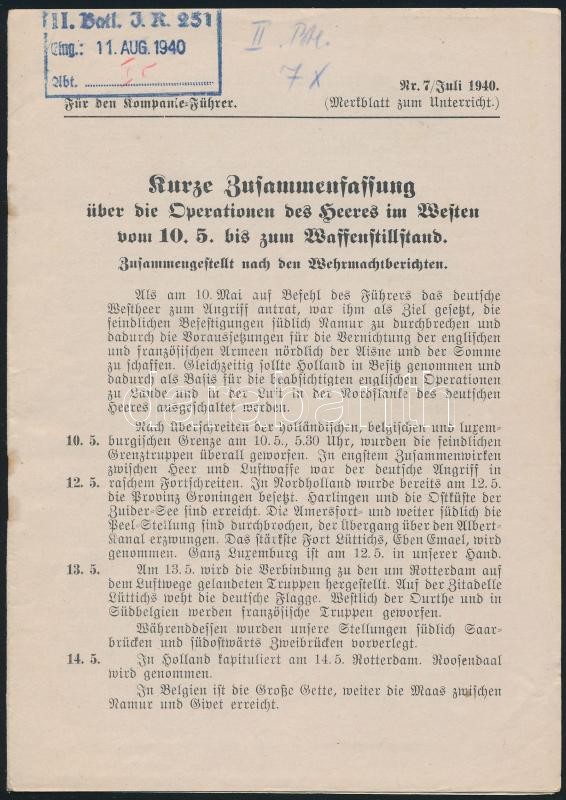 1940 Kurze Zusammenfassung über die Operationen des Heeres im Westen vom 10.5. bis zum Waffenstillstand. Zusammengestellt nach den Wehrmachtberichten. Nr. 7./Juli 1940. Für den Kompanie-Führer. Német nyelven, térkép melléklettel, 8 p. +4 t./ In german language, with map, 8 p.+ 4 t.