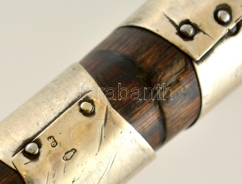 Leírás: Régi sétabot, ezüst(Ag) rátétekkel, jelzett, h: 84 cm