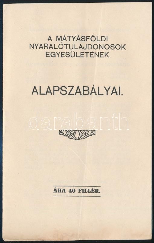 1917 A Mátyásföldi Nyaralótulajdonosok Egyesületének Alapszabályai. 15... https://www.darabanth.com/hu/300-Gyorsarveres/300.0/Festmeny-mutargy-papirregiseg-egyeb/Nyomtatvanyok~27/1917-A-Matyasfoldi-Nyaralotulajdonosok-Egyesuletenek-Alapszabalyai-15p~II1608339