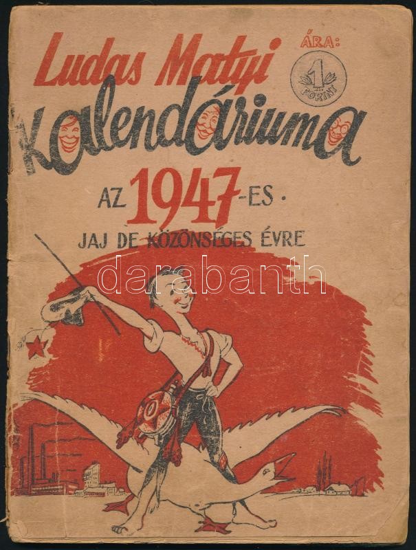 1947 Ludas Matyi kalendáriuma Bp., 1946, Szikra, Viseltes borítóval, 6... https://www.darabanth.com/hu/300-Gyorsarveres/300.0/Festmeny-mutargy-papirregiseg-egyeb/Nyomtatvanyok~27/1947-Ludas-Matyi-kalendariuma-Bp-1946-Szikra-Viseltes-boritoval-64-p~II1606256