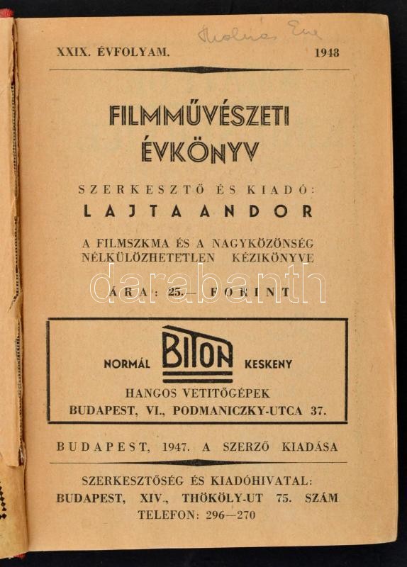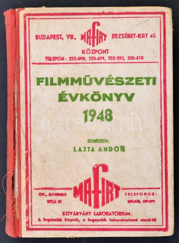 1948 Filmművészeti évkönyv. XXIX. évf. Szerk.: Lajta Andor, 426. Félvászon, kissé viseltes állapotban, sérült gerinccel, de belül jó állapotban. korabeli reklámokkal.