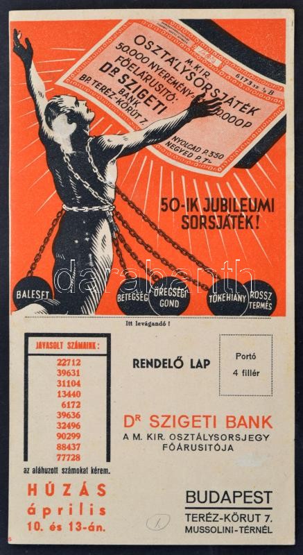 cca 1940 Szigeti Bank osztálysorsjáték rendelő lap https://www.darabanth.com/hu/300-Gyorsarveres/300.0/Festmeny-mutargy-papirregiseg-egyeb/Nyomtatvanyok~27/cca-1940-Szigeti-Bank-osztalysorsjatek-rendelo-lap~II1609970
