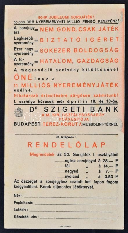 Leírás: cca 1940 Szigeti Bank osztálysorsjáték rendelő lap