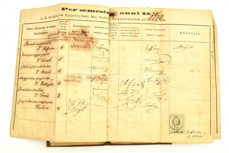Leírás: 1871 Pest, Magyar Király Tudományegyetem egyetemi leckekönyve a jogi karról, benne tanárok aláírása, okmánybélyegek, kissé viseltes állapotban