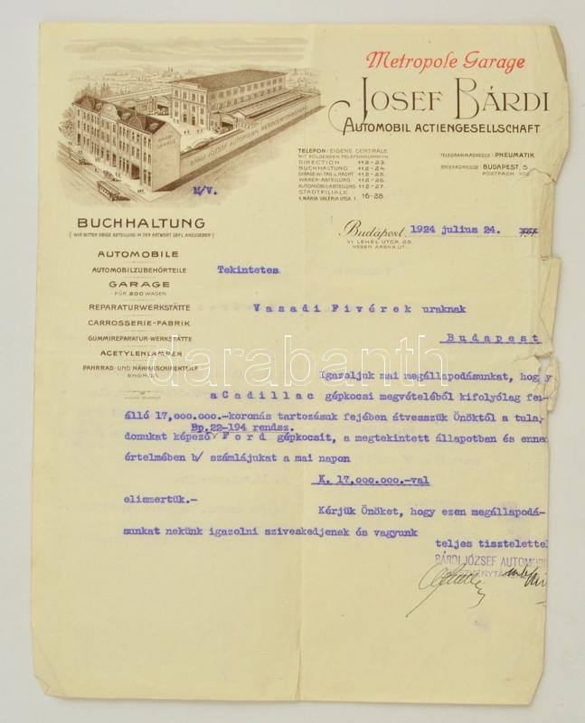 1924 Bárdi József Automobil Rt. díszes fejléces számla, szélénél szaka... https://www.darabanth.com/hu/300-Gyorsarveres/300.0/Festmeny-mutargy-papirregiseg-egyeb/Okmanyok~16/1924-Bardi-Jozsef-Automobil-Rt-diszes-fejleces-szamla-szelenel-szakadasok-29x22-cm~II1608163