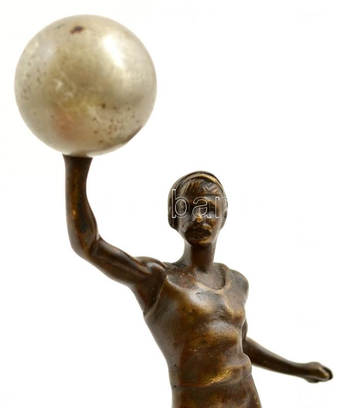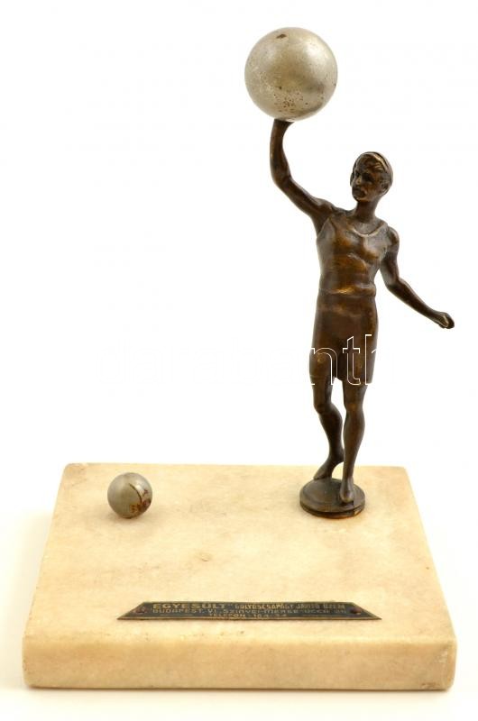 Leírás: Bronz férfi szobor, alabástrom talapzaton, 'Egyesült Golyóscsapágy Javító Üzem', kis sérülésekkel a talapzaton, m: 17 cm.