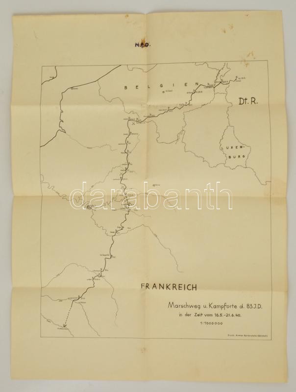 Német hadsereg felvonulási iránya Franciaországban, 1940-ben, térkép, Frankreich, Marschweg u. Kampforte d. 83. J. D. in der Zeit vom 16.5.-21.6.40, 1:1000.000, Armee Kartenstelle, német nyelven, 51x42 cm./ Marching route and camped of the German Army in Franc, in 1940, map, Frankreich, Marschweg u. Kampforte d. 83. J. D. in der Zeit vom 16.5.-21.6.40, 1:1000.000, Armee Kartenstelle, in German language, 51x42 cm.