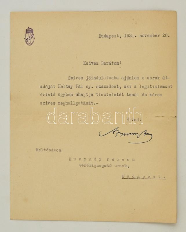 1931 Apponyi Albert (1846-1933) gépelt ajánlólevele Hunyady Ferenc (18... https://www.darabanth.com/hu/300-Gyorsarveres/300.0/Festmeny-mutargy-papirregiseg-egyeb/Tortenelmi-dokumentumok-keziratok-erdekessegek~17/1931-Apponyi-Albert-1846-1933-gepelt-ajanlolevele-Hunyady-Ferenc-1874-vezerigazgato-resz~II1607289