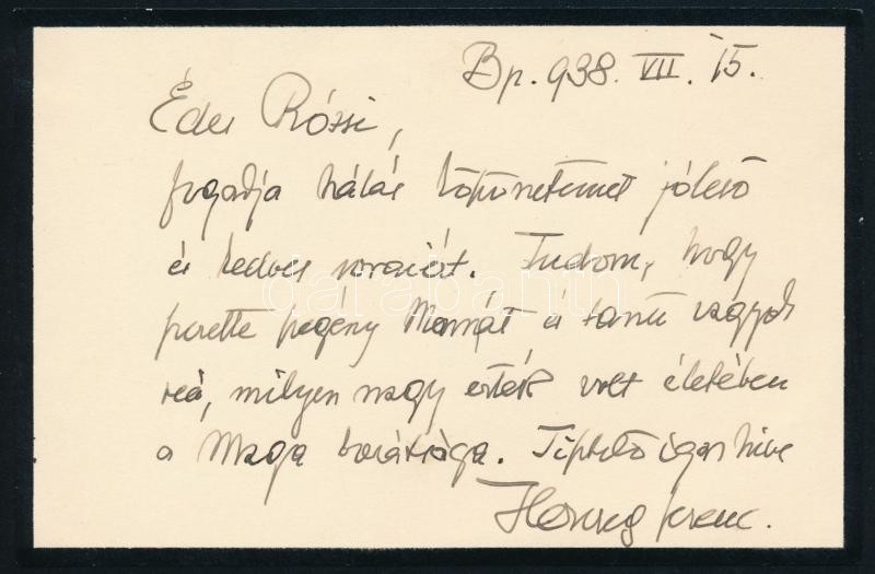 1938 Herczeg Ferenc (1863-1954) személyes hangú köszönő levele édesanyja halála alkalmából Hegedüs Rózsának, Hegedüs Sándor politikus és Jókai Jolán lányának, ifj. Hegedüs Sándor író és Hegedüs Loránt politikus hugának