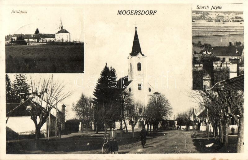 Leírás: Nagyfalva, Mogersdorf; Schlössl, Storch Idylle / kastély, utcakép templommal, kerékpár. K. Andrecs kiadása / castle, street view with church, bicycle