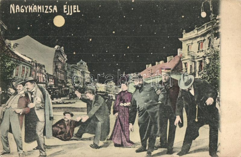 Leírás: Nagykanizsa, Fő tér, éjjeli humoros részeges montázslap (EK)